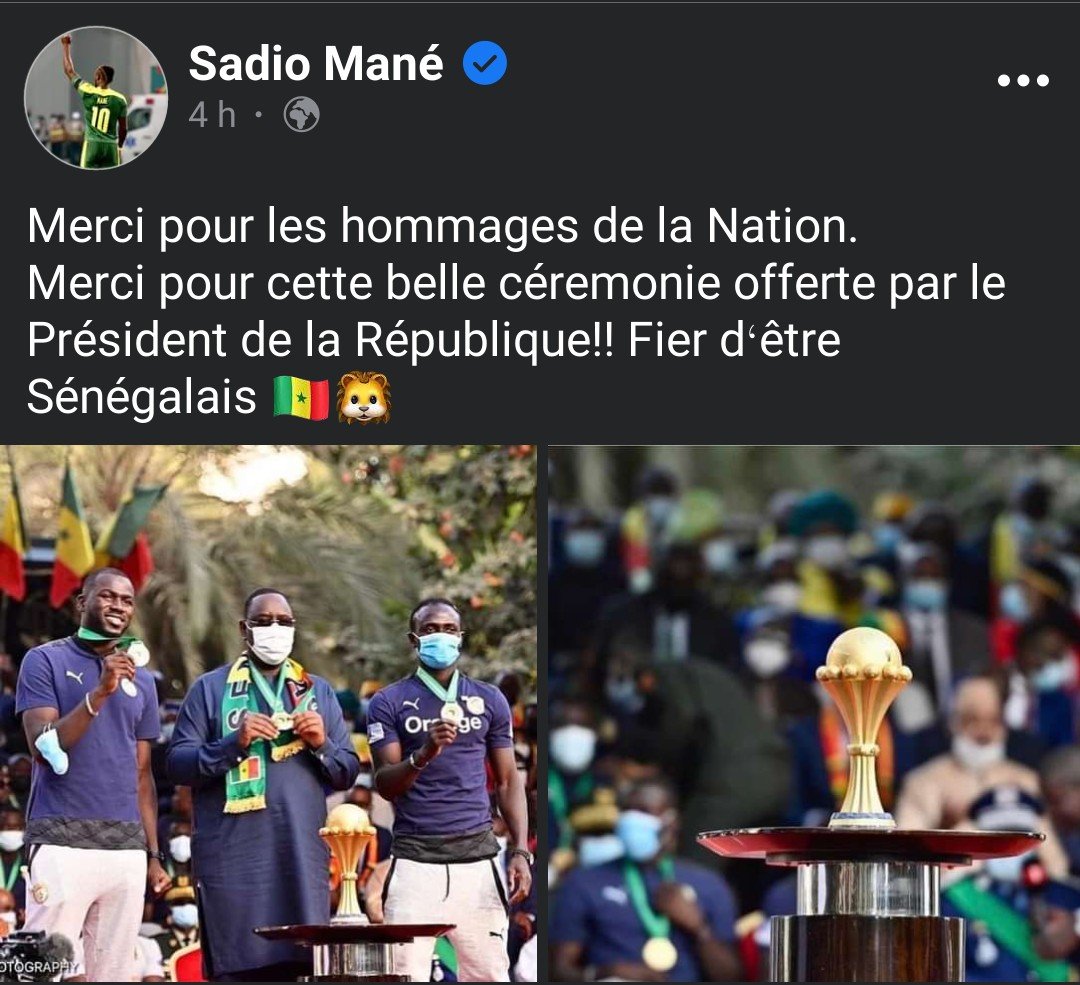 Le dimanche 06 février 2022 est un jour qui restera gravé dans l’histoire des sénégalais. Cette est est celle à laquelle Sadio Mané et ses coéquipiers ont remporté la première Can de l’histoire du Sénégal suite à leur victoire en finale face à l’Égypte aux tirs au but. Après avoir triomphé, les héros sont rentrés au pays où ils ont été reçus par le président Macky SALL et le peuple sénégalais par le biais d’une grande cérémonie. Ému par les évènements, Sadio Mané a montrer sa reconnaissance à travers une publication sur sa page facebook.