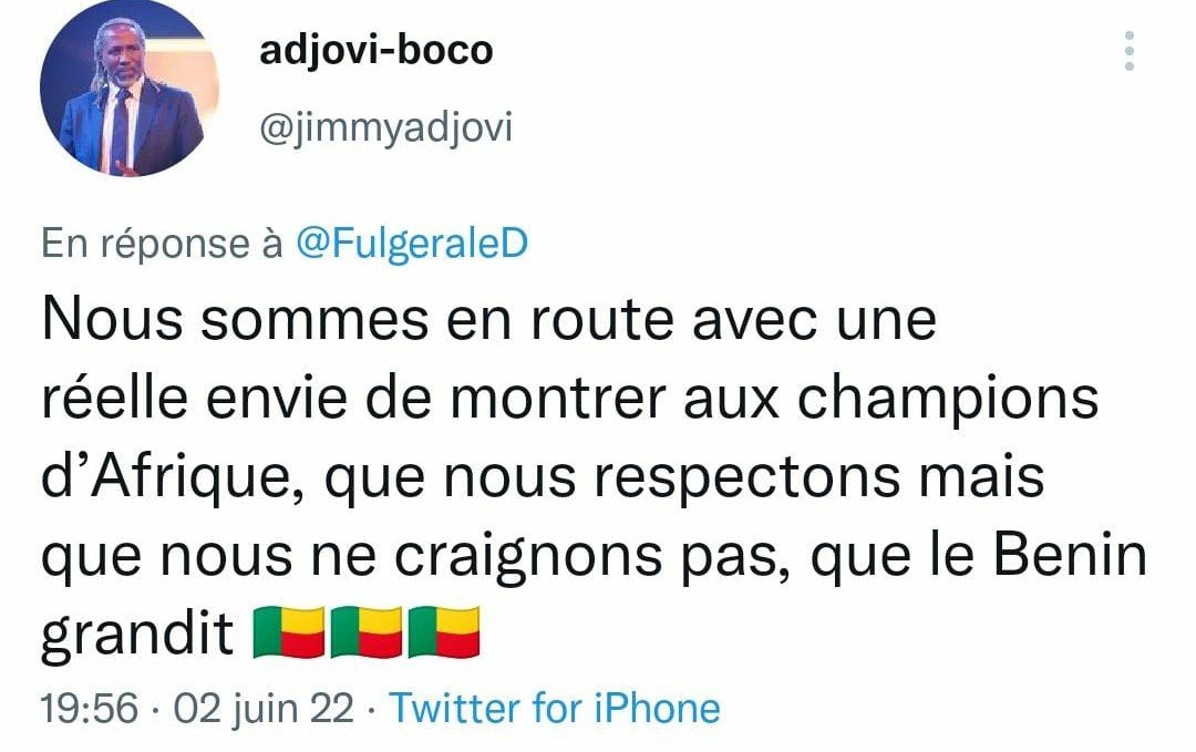 Sur Twitter, le conseiller technique du ministre des sports du Bénin, Adjovi Boco, n’a pas tarder pour confirmer le décollage de l’équipe nationale, avec un message clair sur l’objectif des Ecureuils.