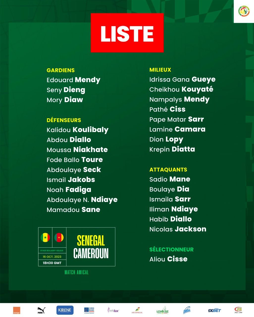 Le sélectionneur des champions d’Afrique, Aliou Cissé, a dévoilé la liste des 26 joueurs retenus pour le match amical du Sénégal contre le Cameroun, prévu le 16 octobre 2023 à Lens. La liste présente quelques changements en raison de quelques absences. Aliou Cissé a choisi d’appeler pour la première fois Mamadou Sané, âgé de 18 ans et joueur de l’Aris Limassol à Chypre. Il s’agira de sa première véritable apparition avec l’équipe A.