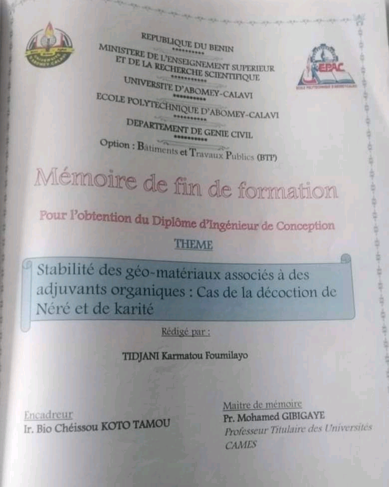 C’est au département de génie civil de l’école polytechnique de l’université d’Abomey Calavi (EPAC) que la soutenance s’est déroulée le vendredi 17 juin 2022. Et face au jury, Karamatou Tidjani , défenseuse de Black Stones en 1ère division Féminine du Bénin, qui défend le thème de son mémoire intitulé « Stabilité des géo-matériaux associés à des adjuvants organiques : cas de la décoction de néré et de karité ». Au terme de sa présentation, elle obtient son master avec mention(très bien) accompagnée des félicitations du jury.