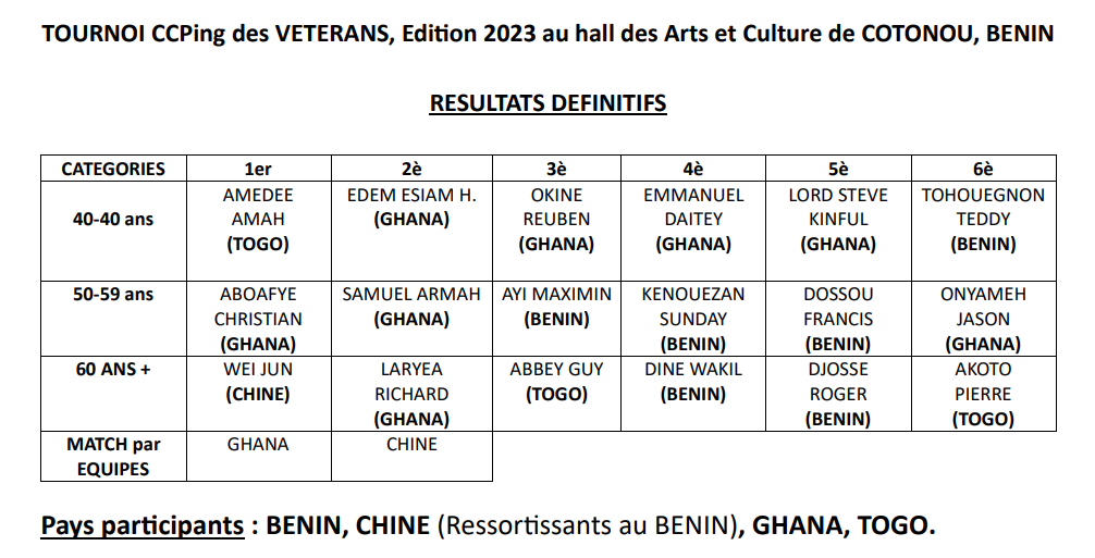 Le samedi 30 septembre 2023, le Hall des arts, loisirs et sports de Cotonou au Bénin a été le théâtre d’un événement remarquable pour les amateurs de tennis de table. Il s’agissait du Tournoi CPPing des vétérans, édition 2023, qui a réuni quatre équipes de différentes nationalités : le Bénin, la Chine (représentée par des ressortissants au Bénin), le Ghana et le Togo. Dans une atmosphère de convivialité, cette compétition a offert des matchs de haut niveau tant en équipes qu’en individuel, pour le plus grand plaisir des participants et des spectateurs.