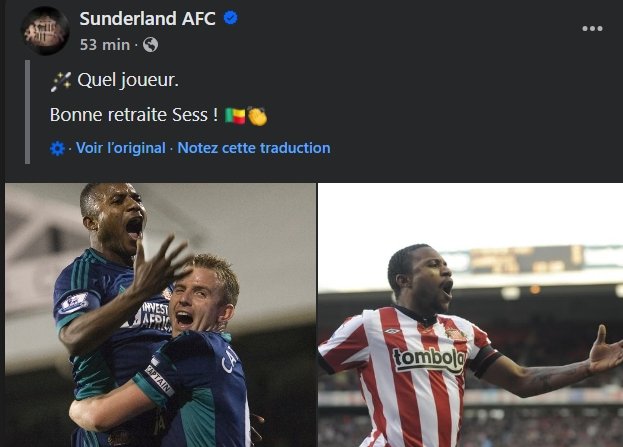 Après la confirmation officielle de la retraite sportive de Stéphane Sessègnon, son ancien club anglais Sunderland AFC a tenu à saluer l’ancien meneur de jeu béninois par un message chaleureux sur ses réseaux sociaux. Sur sa page Facebook officielle, le club de Championship a publié : « 🪄 Quel joueur. Bonne retraite Sess ! 🇧🇯👏 », accompagné d’une série de photos souvenirs de l’époque où Sessègnon portait le maillot noir et rouge (2011-2013).