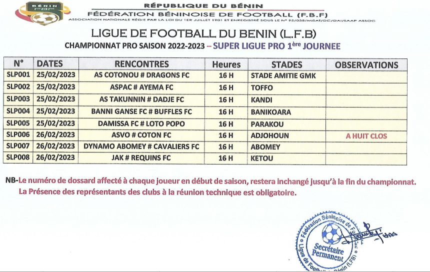 Plus que quelques jours et la Super Ligue Pro 2022-2023 du Bénin va prendre son envole. Sauf changement de dernière minute, cette deuxième phase du championnat béninois qui concerne les clubs qui ont terminé parmi les quatre premiers de leur zone au cours de la première phase (Ligue Pro), va débuter le 25 février 2023. En attendant le coup d’envoi, découvrez le programme de la première journée.