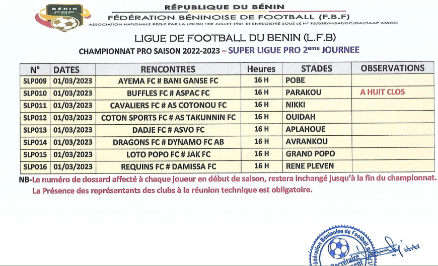 Lancée officiellement le 25 février 2023, la Super Ligue Pro 2022-2023 va enchainer ce mercredi 1er Mars 2023 avec sa deuxième journée. À la veille des rencontres, retour sur les affiches de cette deuxième sortie des clubs béninois.