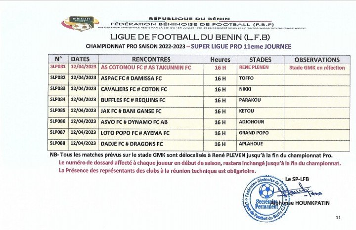 Après avoir clôturé l’acte 10 le dimanche 09 avril 2023, la Super Ligue Pro du Bénin va enchainer avec la 11ème journée ce mercredi 12 avril 2023. Comme à l’accoutumée, plusieurs rencontres seront au rendez-vous à travers tout le Bénin. De belles affiche sont au progromme lors de cette 11ème journée. Découvrez le programme.