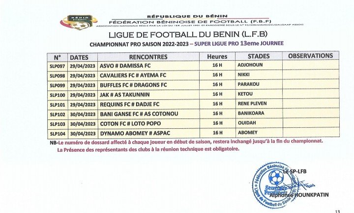 Après quelques jours de pause au terme de la phase aller, la Super Ligue Pro, saison 2022-2023, va faire son retour à partir du samedi 29 avril 2023. La 13ème journée du championnat professionnel du Bénin va marquer le début de la phase retour. Huit (8) rencontres sont au programme entre le samedi 29 et le dimanche 30 avril 2023 pour cette reprise. Découvrez le programme.
