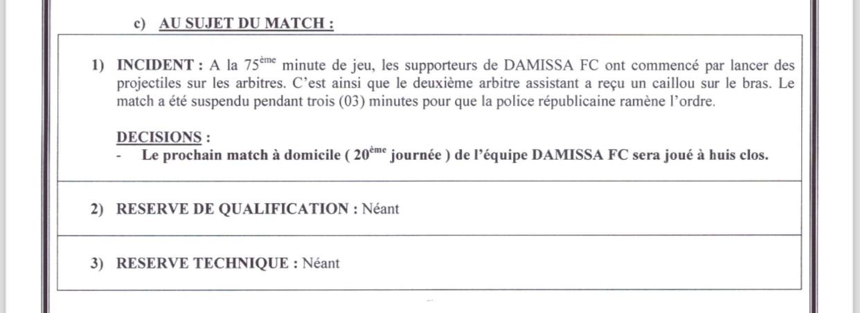 « À la 75e minute de jeu, les supporters de Damissa FC ont commencé par lancer des projectiles sur les arbitres. C’est ainsi que le deuxième arbitre assistant a reçu un caillou sur le bras. Le match a été suspendu pendant trois minutes pour que la police républicaine ramène l’ordre. », a indiqué la COHC de la Fédération Béninoise de Football dans son rapport.