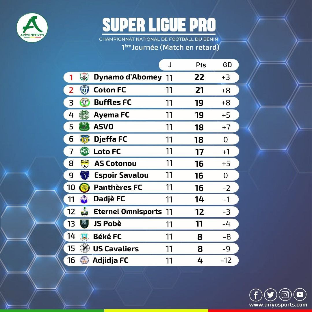 Au même moment, Coton FC étrille Djèffa FC et remporte largement de la plus belle manière le plus grand choc de la journée, et devient dauphin talonnant de près le premier. Un revers aux lourdes conséquences par contre pour son adversaire du jour qui chute du podium et dégringole à la 6e place.