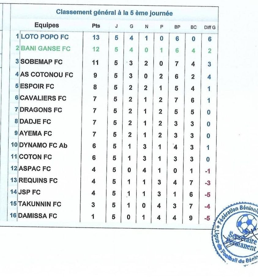 Lancée le samedi 02 mars 2024, la cinquième journée de la Super Ligue Professionnelle de football du Bénin s’est clôturée le dimanche 25 février 2024. Une journée riche et bouleversante au sommet du classement. La nouvelle la plus est enfin cette première victoire décrochée par le champion en titre, Coton FC. De son côté, Loto-popo ne lâche rien après avoir pris la tête du championnat. Découvrez les résultats et le classement.