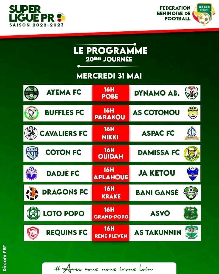 Ce mercredi 31 mai 2023, la Super Ligue Pro saison 2022-2023 sera à sa 20e journée. Huit (08) matchs sont au programme à Pobè, Parakou, Nikki, Ouidah, Aplahoué, Kraké, Grand-Popo et Cotonou. Découvrez le programme de toutes les rencontres.