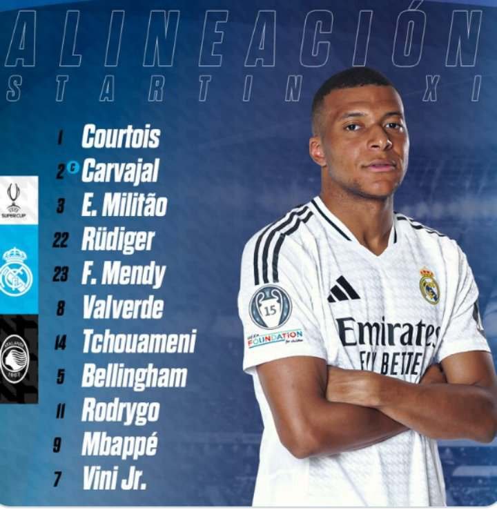 Ce mercredi 14 aout 2024, le Real Madrid affronte l’Atalanta en finale de Supercoupe de l’UEFA 2024. Cette rencontre sera la première pour Kylian Mbappé depuis qu’il a signé au club. L’attaquant français a été titularisé pour le match.