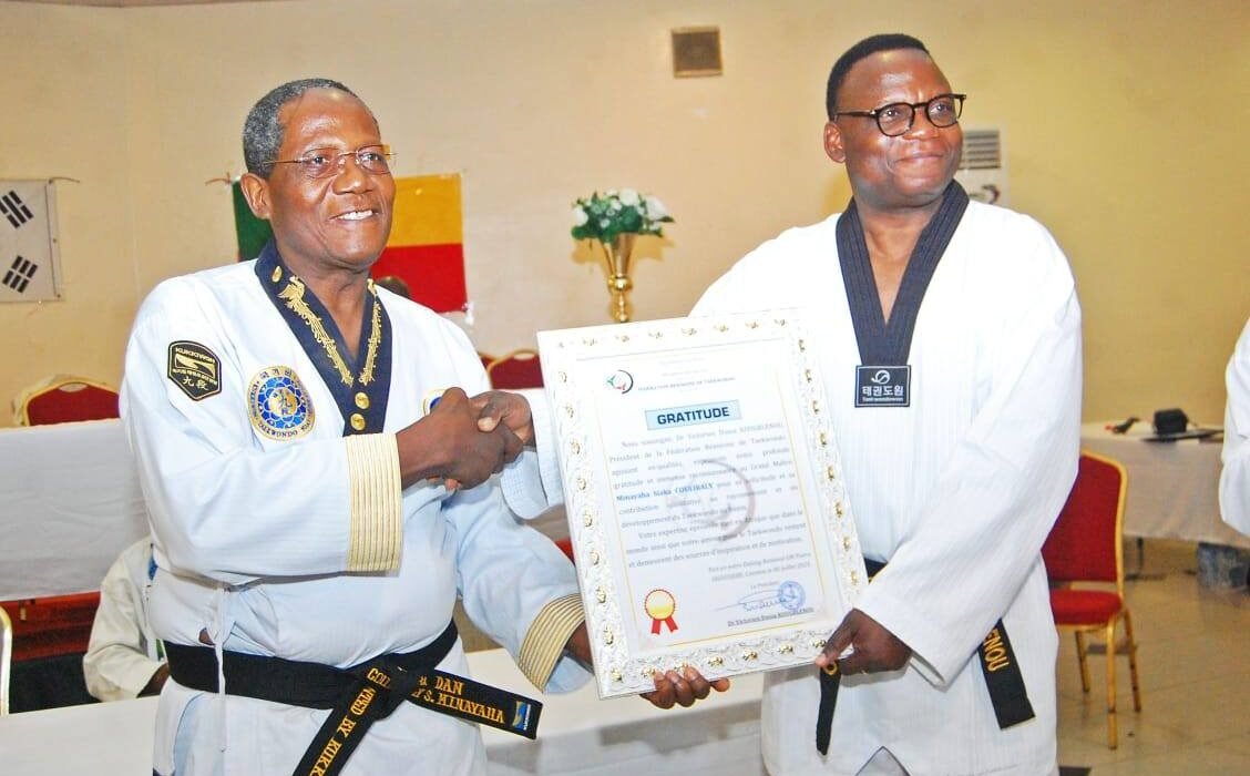 Moment fort de la journée : quatre Grands Maîtres béninois ont été honorés pour leur contribution exceptionnelle à la discipline. Ils ont reçu des attestations officielles et des Ceintures Noires 6e Dan Kukkiwon, symbole de leur maîtrise et de leur engagement : Éric Azando, Jacques Noutaï, Da-Costa Marius Florent, Colonel Cassien Djigla. Un hommage solennel qui témoigne de la volonté du Président Docteur Jules Victorien Kougblénou et de son comité exécutif de célébrer le mérite et de valoriser les parcours inspirants.
