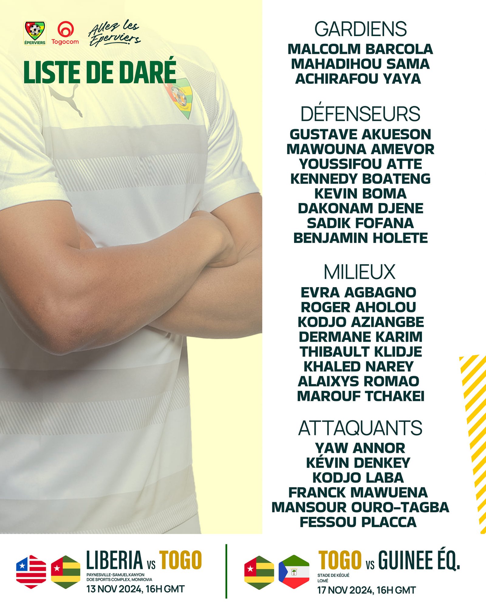 Le Togo se prépare pour deux matchs décisifs en novembre 2024. La fédération togolaise, a révélé ce jeudi 07 novembre 2024 la liste des joueurs convoqués pour les rencontres des 5e et 6e journées des éliminatoires de la CAN 2025. Les Éperviers affrontent le Libéria à Monrovia le 13 novembre, et Guinée EQ le 17 novembre 2024 à Lomé. 25 Éperviers retenus par le sélectionneur Daré Nibombé pour ces rendez-vous.