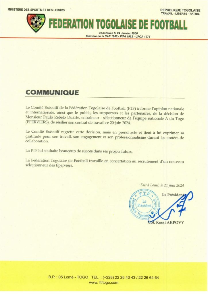 Ce vendredi 21 juin 2024, le Comité Exécutif de la Fédération Togolaise de Football (FTF) a annoncé la démission de Paulo Rebelo Duarte, entraîneur-sélectionneur du Togo. Dans un communiqué officiel, la FTF a révélé que Paulo Duarte a décidé de résilier son contrat de travail le 20 juin 2024.