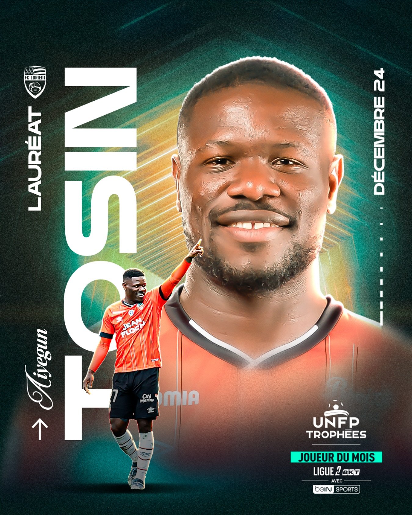Les récentes performances de Tosin Aiyegun avec le FC Lorient ont été payantes. Grâce à une belle série de prestations décisives au cours du mois de décembre 2024, il a été élu Joueur du Mois de la Ligue 2 BKT par l’Union Nationale des Footballeurs Professionnels (UNFP). L’international béninois a brillé à plusieurs reprises en aidant son club à obtenir des résultats positifs. Ce trophée vient couronner son impact offensif et son rôle clé dans l’effectif lorientais.