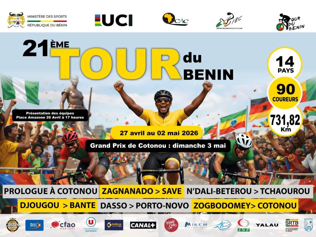 Les festivités débuteront officiellement le 26 avril 2026 avec la présentation des équipes. Le lendemain, le 27 avril, la compétition s’ouvrira par un prologue dans la ville de Cotonou, marquant le véritable coup d’envoi de la course.