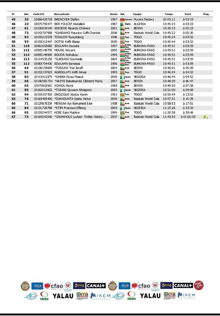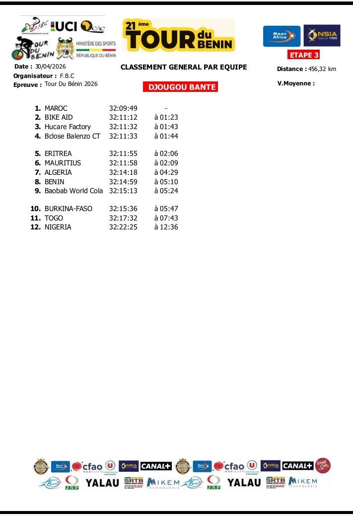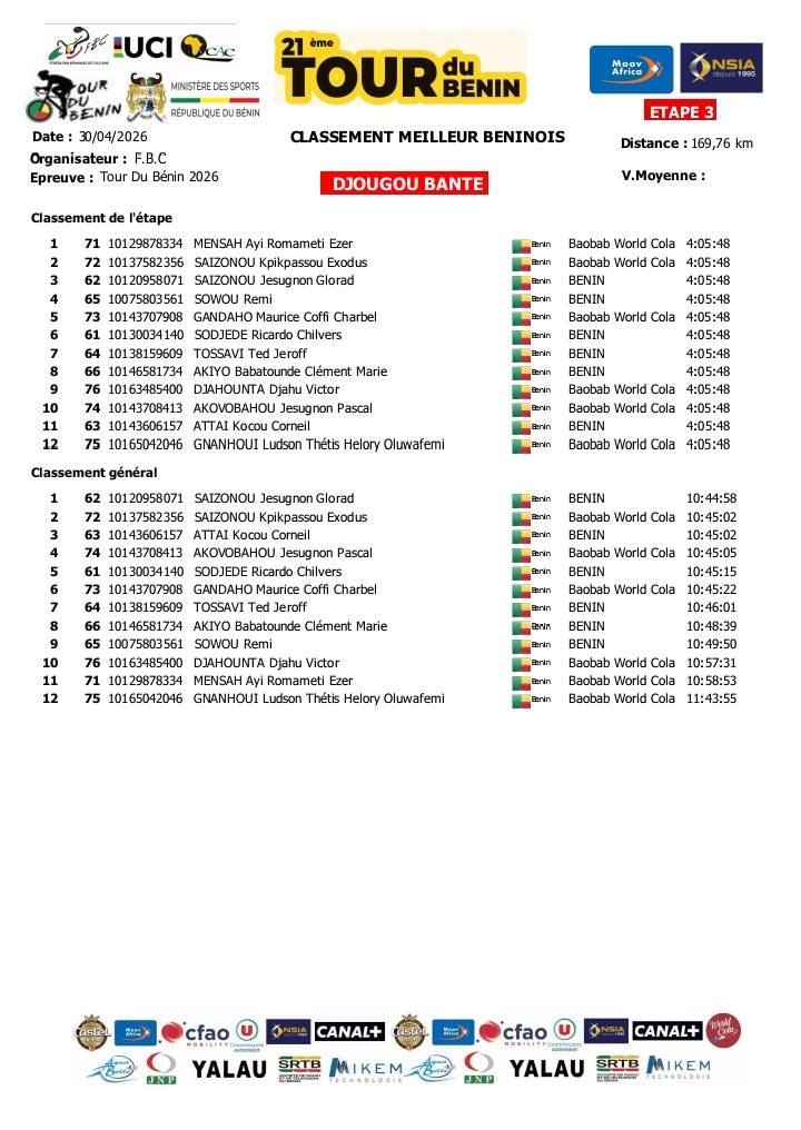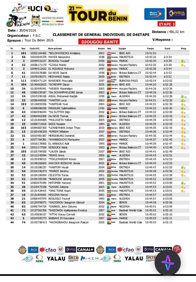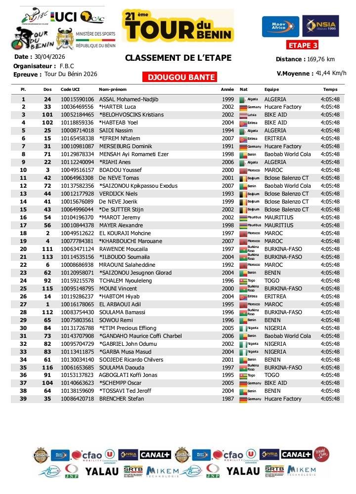 Assal Nadjib devance : Luca Harter (Hucare Factory, Allemagne), et Belohvosciks Kristians (Team Bike AID, Allemagne). Un podium international qui illustre la densité du peloton sur cette édition 2026. Pour cette étape 3 Djougou — Bantè, 169,76 Km, le top départ a été donné à 9h47 (Chrono officiel) devant la Mairie de Djougou.