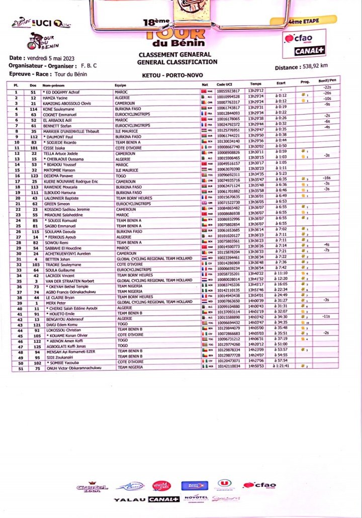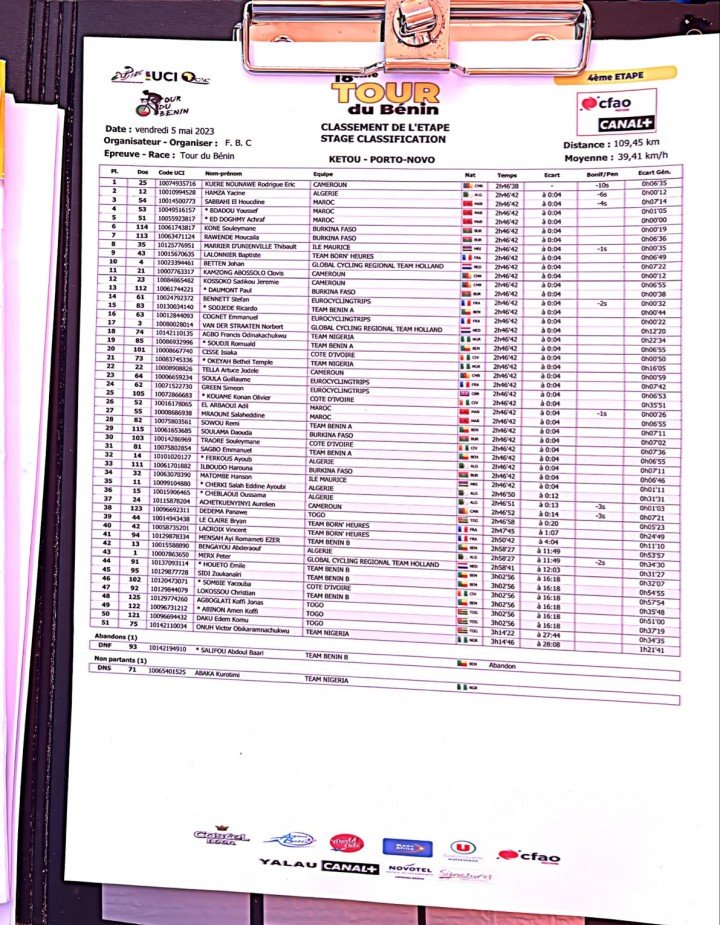 Outre la belle performance de Ricardo Sodjèdé, voici le classement complet après la quatrième étape du Tour Cycliste International du Bénin 2023 :
