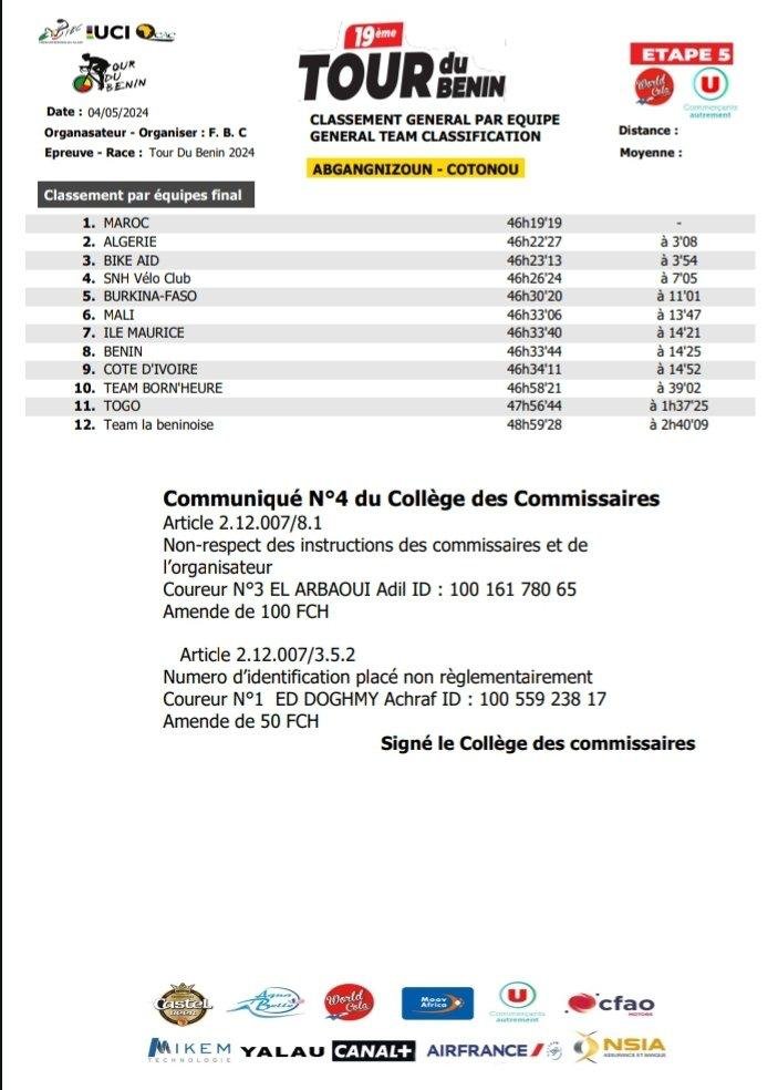 La 19ème édition du Tour cycliste international du Bénin s’est achevée samedi 04 mai 2024 avec la victoire du Marocain Achraf Ed-Doghmy. L’heure est déjà au bilan, notamment pour les béninois. Malgré un classement modeste au Tour du Bénin 2024, le Bénin tire des leçons positives de sa performance. Classé 8e sur 12 au classement par équipe, les coureurs béninois ont démontré leur résilience face à une compétition de haut niveau.