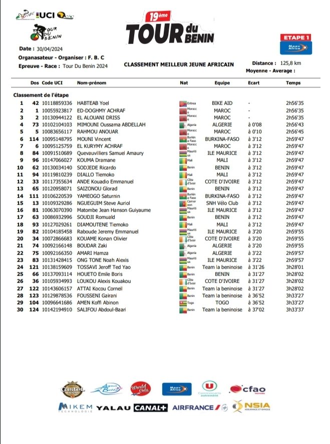 Le tour du Bénin a déjà pris son envol ce mardi 30 avril 2024. À l’issue de la première étape, huit cyclistes béninois se sont distingués en figurant dans le classement du meilleur jeune africain de la compétition.