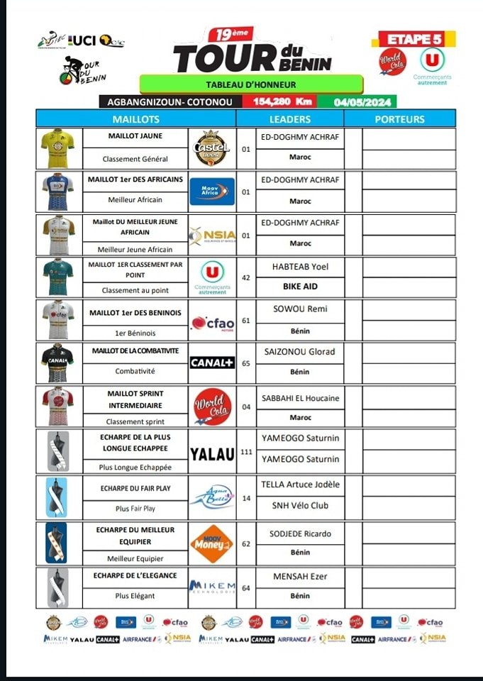 Le Tour du Bénin 2024 a pris fin ce dimanche 05 mai 2024. Place désormais au bilan des coureurs qui se sont distingués tout au long de cette édition. Parti de Boukoumbé et traversant 11 départements sur une distance de 646,470 km, ce tour cycliste international a été marqué par des moments palpitants et des performances exceptionnelles.