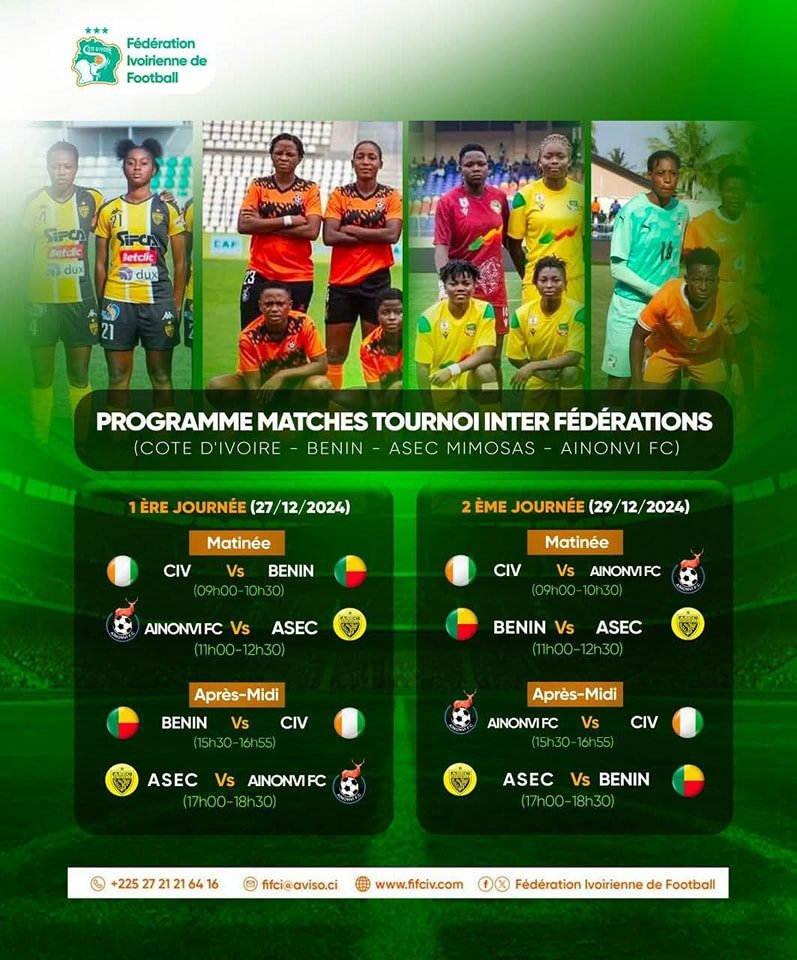 Du 27 au 30 décembre 2024, la capitale ivoirienne Abidjan accueillera un tournoi inter-fédérations inédit, organisé par la Fédération Ivoirienne de FootballDu 27 au 30 décembre 2024, la capitale ivoirienne Abidjan accueillera un tournoi inter-fédérations inédit, organisé par la Fédération Ivoirienne de Football (FIF) en collaboration avec la Fédération Béninoise de Football (FBF). Ce tournoi marque une étape importante dans la promotion du football féminin en Afrique de l’Ouest et offrira un cadre compétitif et festif à quatre équipes de haut niveau.