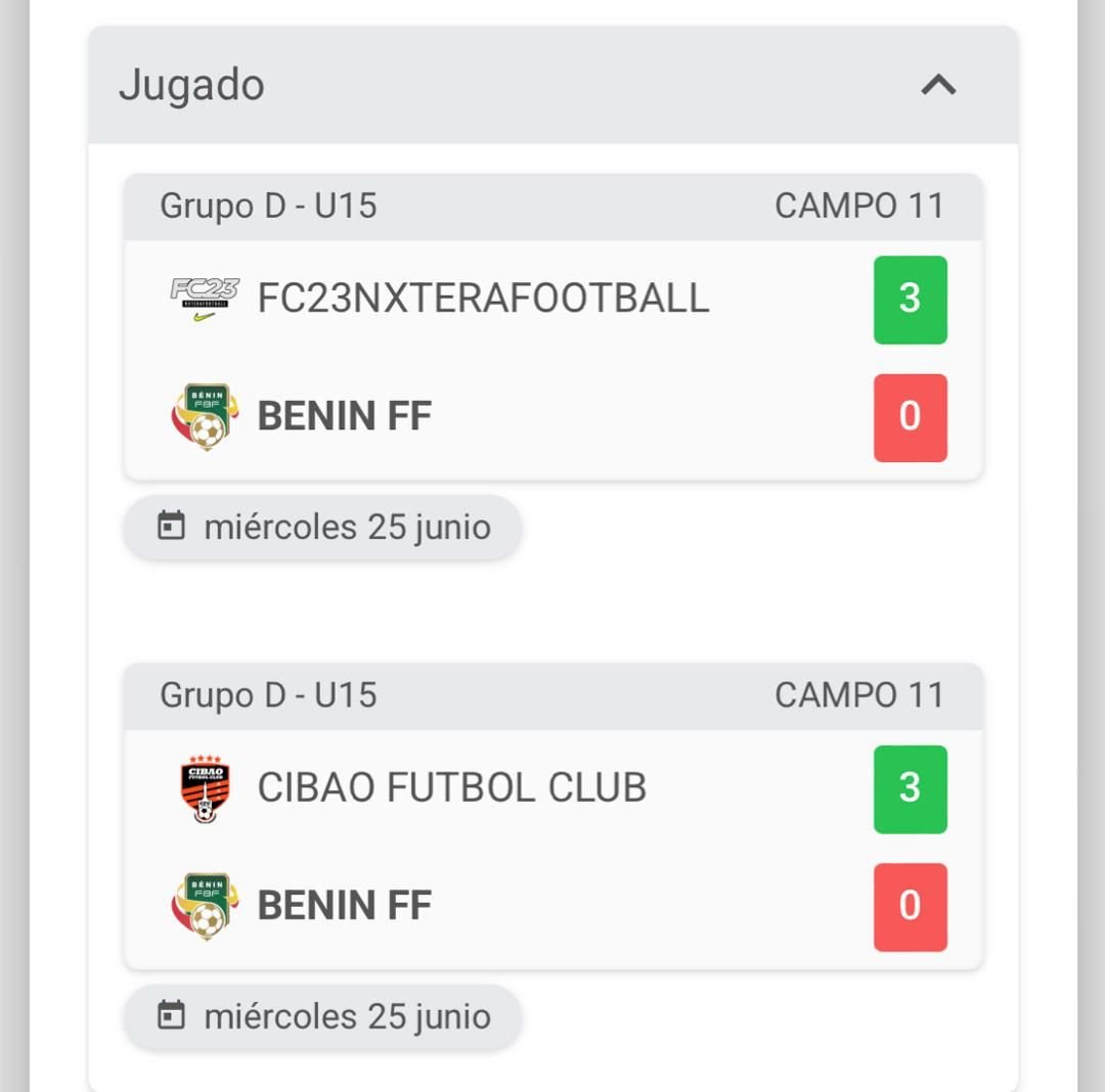 Ainsi, le Bénin a perdu par forfait ses deux premiers matchs (3-0 contre Cibao FC et 3-0 contre FC 23 NXTPRO), mais s’est brillamment rattrapé sur le terrain en remportant les deux suivants :