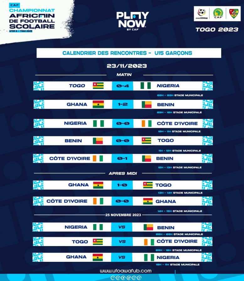 Les résultats des premiers matchs du Tournoi UFOA-B Garçons U15 Scolaire, qui se déroule à Lomé en 2023, ont confirmé la bonne forme de l’équipe béninoise. Voici un récapitulatif des matchs et le classement provisoire.