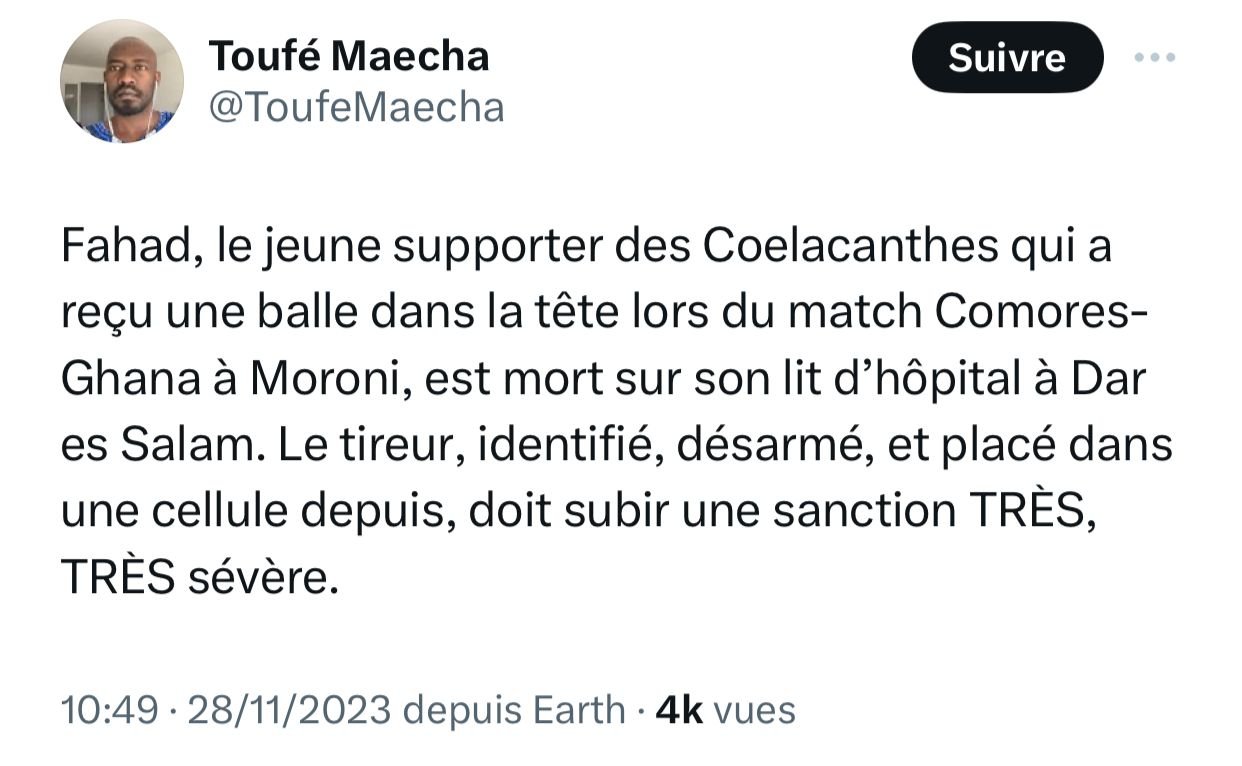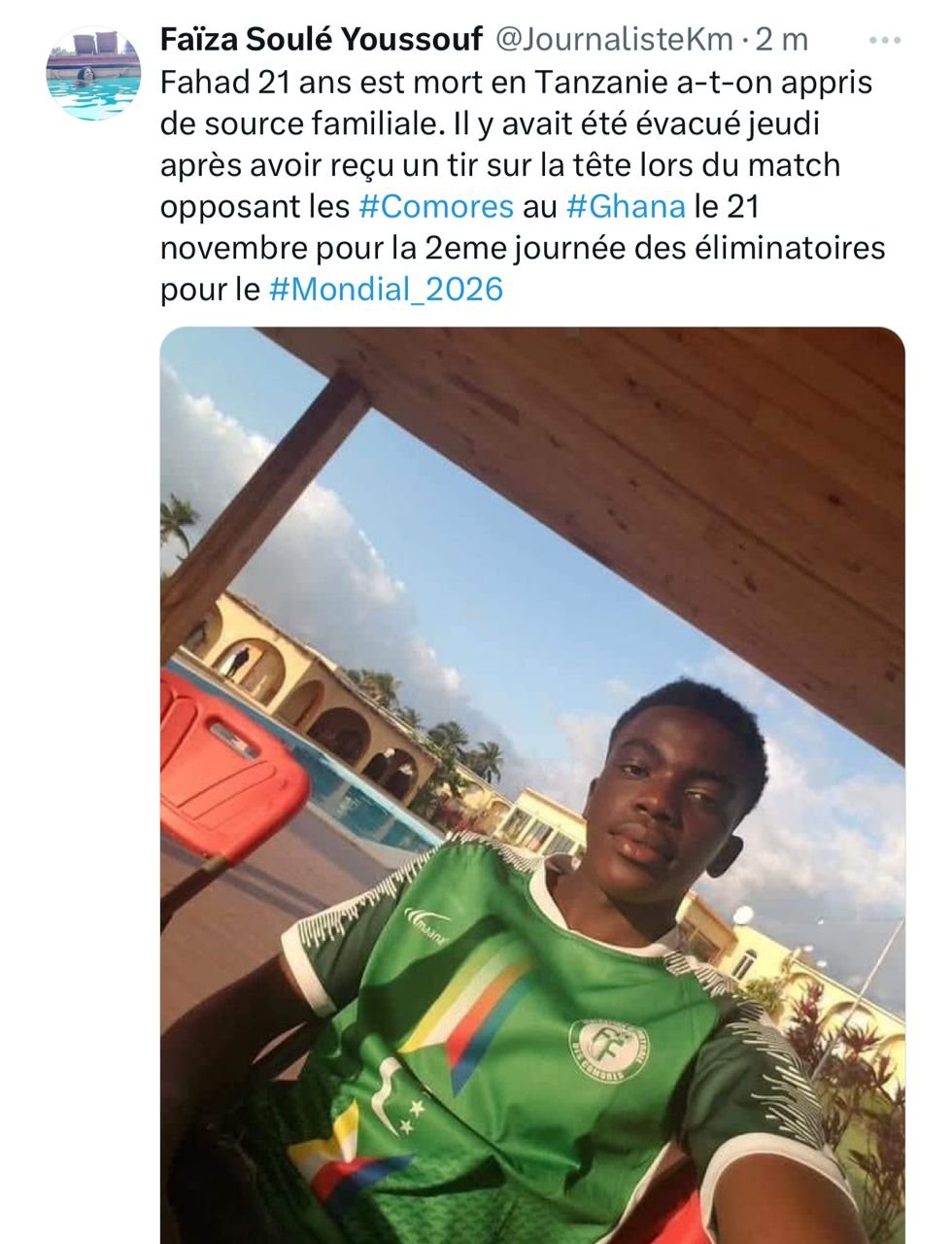 Une triste nouvelle a été confirmée quelques jours après le match de qualification pour la Coupe du Monde 2026 entre les Comores et le Ghana qui s’est disputé en novembre 2023. En effet, un jeune supporter de 21 ans, Fahad Moindze, a perdu la vie dans des circonstances tragiques après avoir reçu une balle à l’occasion de la rencontre.