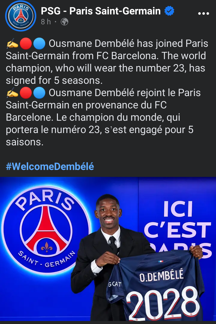 Le footballeur français a signé un contrat de 5 saisons avec le Paris Saint-Germain. Cette signature marque un engagement solide entre Dembélé et le club, illustrant la confiance mutuelle dans le développement continu de sa carrière.