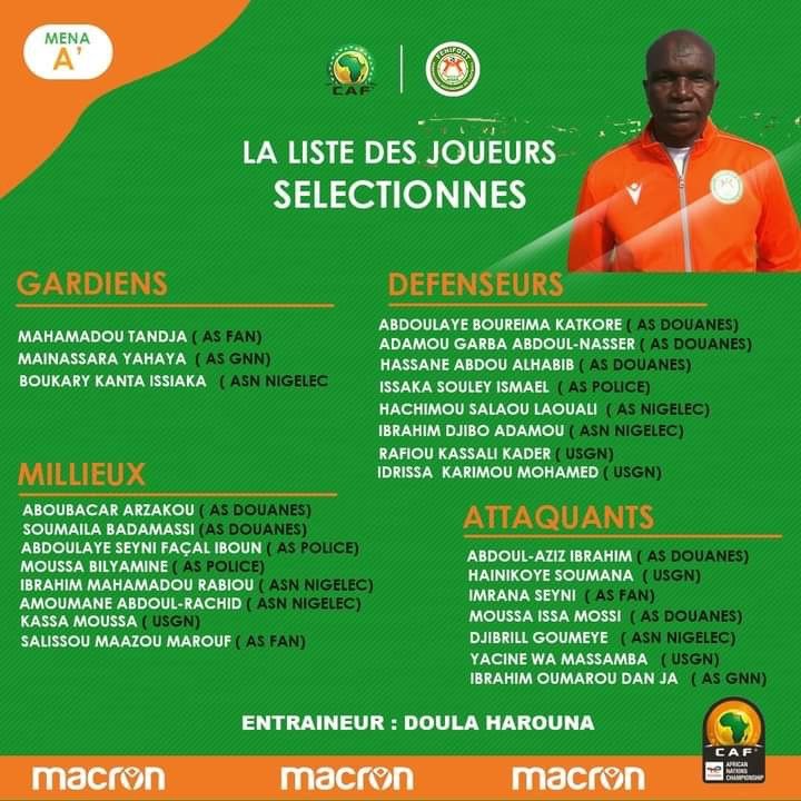Douala HAROUNA, le sélectionneur de l’équipe nigérienne de football, a annoncé la liste officielle des joueurs A’ sélectionnés pour le Championnat d’Afrique des Nations. La compétition se tiendra du 13 janvier au 4 février 2023 en Algérie. Douala HAROUNA a fait confiance au total à 26 joueurs qui prendront part à cette compétition pour le compte de l’équipe nigérienne de football.