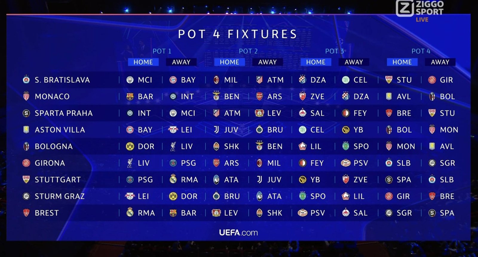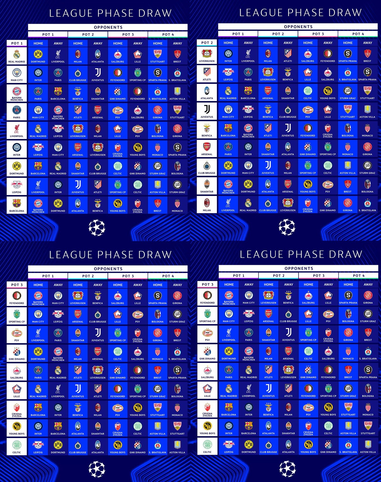 La phase de poules traditionnelle est désormais remplacée par une phase de ligue, où 36 équipes s’affronteront dans un mini-championnat. Chaque équipe jouera 8 matches lors de ce premier tour : 4 à domicile et 4 à l’extérieur, contre des adversaires différents à chaque rencontre.