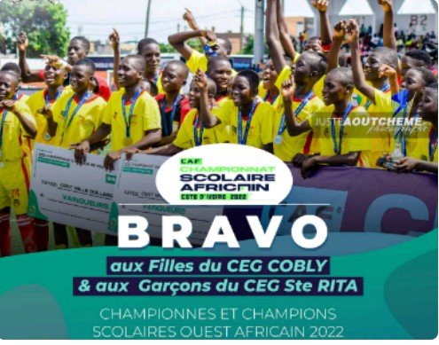 🚨Nos jeunes filles du CEG COBLY et nos jeunes garçons du CEG Ste Rita, déjà champions 2022 des Classes sportives, ont révélé le Bénin au monde du sport scolaire en remportant, le dimanche 13 novembre 2022 à Abidjan en Côted’Ivoire, le premier Championnat scolaire Ouest africain UFOA B. De même, ils ont glané les trophées de meilleur gardien et de meilleur buteur du tournoi, dans les deux catégories.